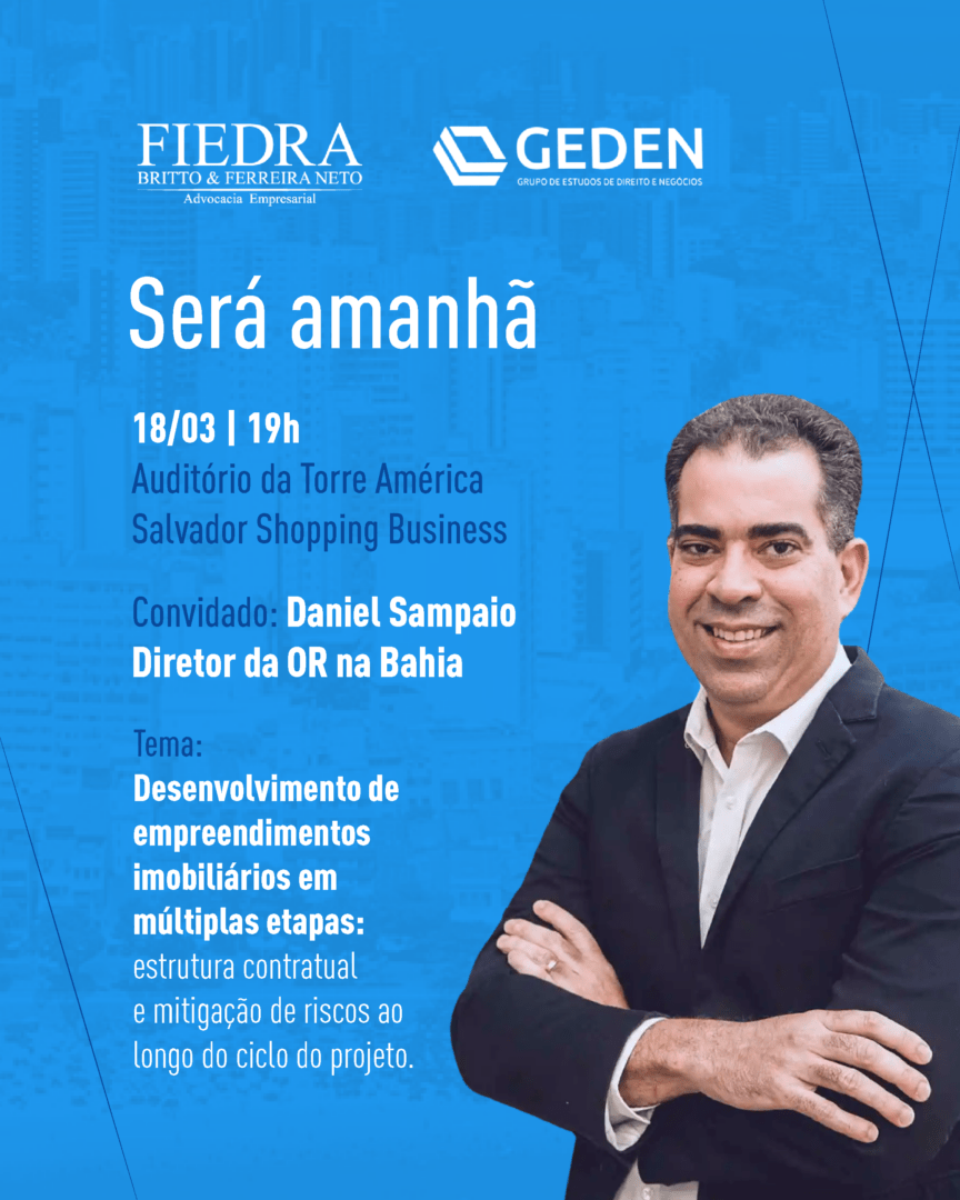 O primeiro encontro do ano terá como tema “Desenvolvimento de Empreendimentos Imobiliários em Múltiplas Etapas: estrutura contratual e mitigação de riscos ao longo do ciclo do projeto”, com a participação de Daniel Sampaio, Diretor Superintendente BA da OR.